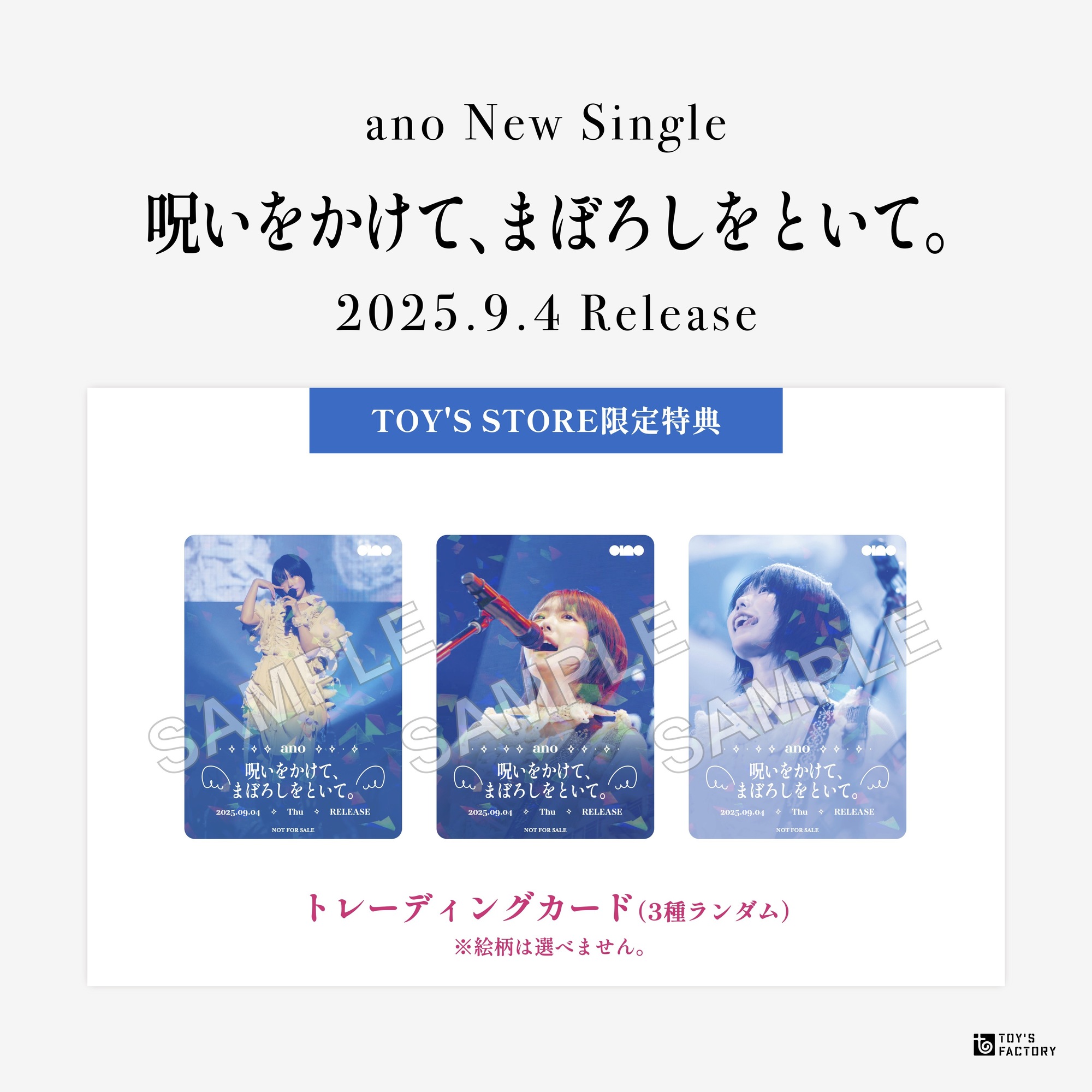 本日8月27日(水)よりTOY’S STOREでCDの予約が開始!商品は、9月4日(木)以降順次発送となります。TOY’S STORE限定特典として、トレーディングカード(3種ランダム)(※絵柄は選べません。)が付くので、ぜひこの機会にチェックしてください!