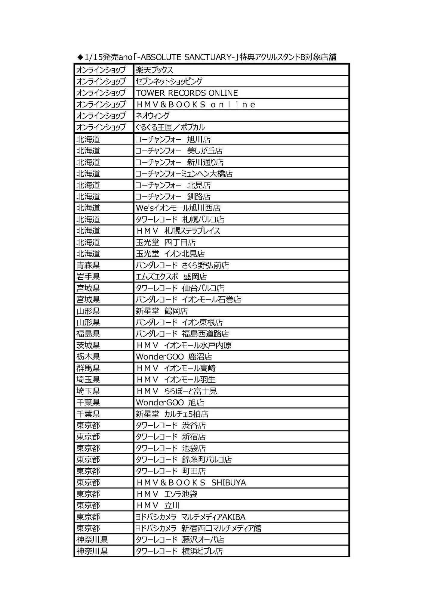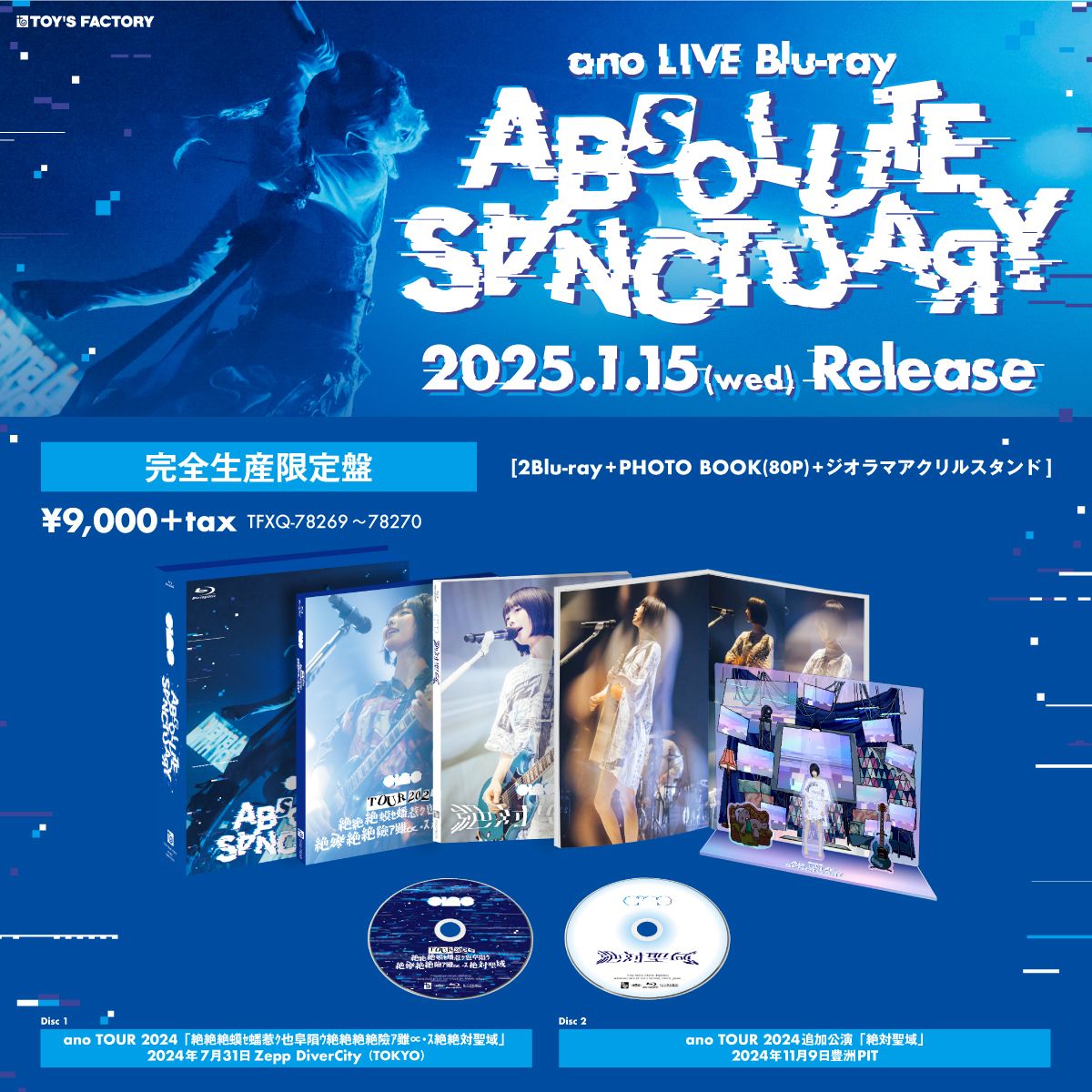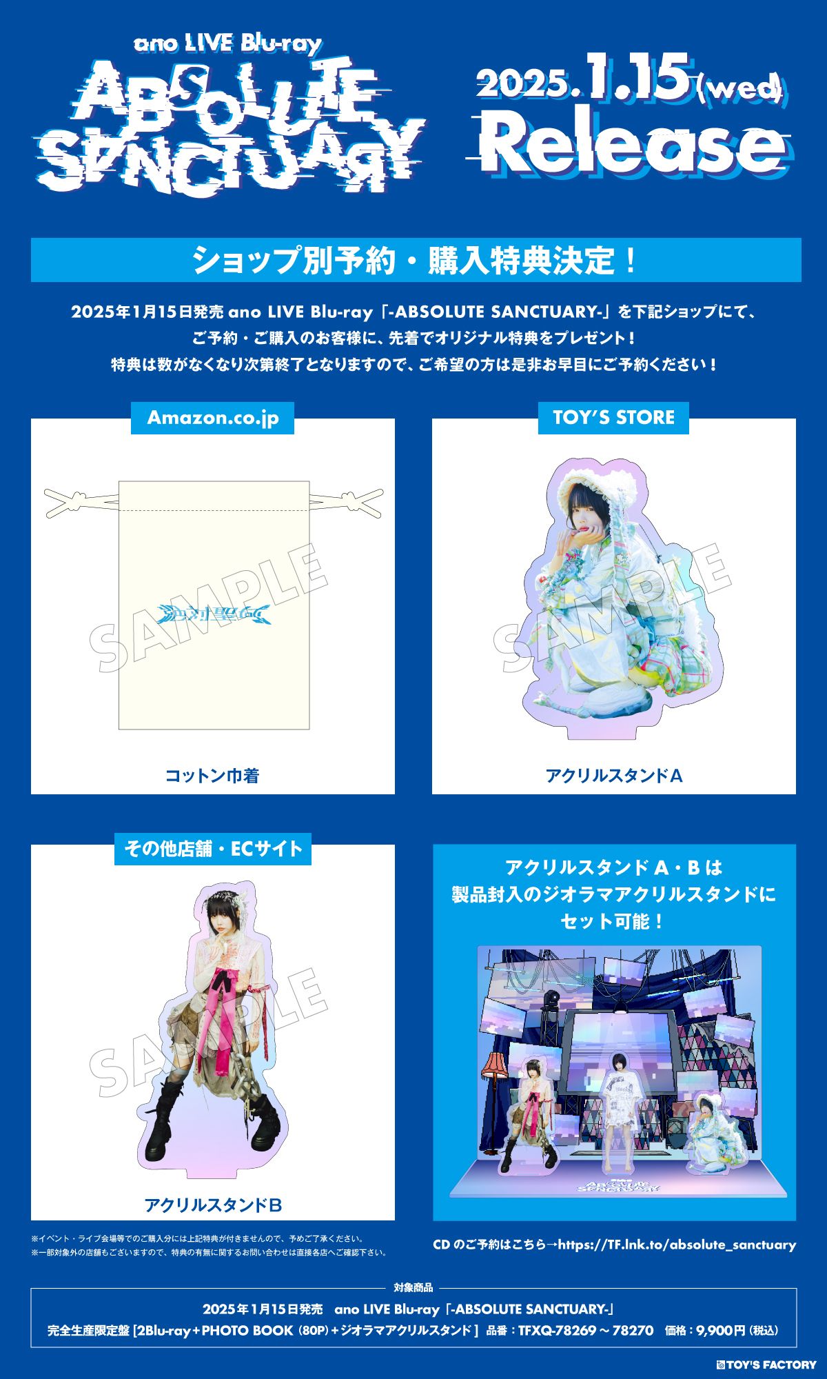 2025年1月15日発売ano LIVE Blu-ray「-ABSOLUTE SANCTUARY-」を下記ショップにて、ご予約・ご購入のお客様に、先着でオリジナル特典をプレゼント!