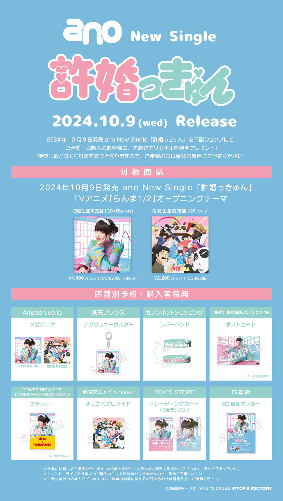 2024年10月9日発売ano New Single「許婚っきゅん」を下記ショップにて、ご予約・ご購入のお客様に、先着でオリジナル特典をプレゼント!